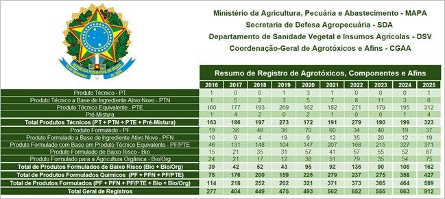 Em 2025, o Brasil atingiu novo recorde de aprovações de registros de pesticidas: 912, sendo 323 Produtos Técnicos (PT + PTN + PTE + Pré-Mistura), 427 Produtos Formulados Químicos (PF + PFN + PF/PTE + biológicos) e 162 Produtos Biológicos.